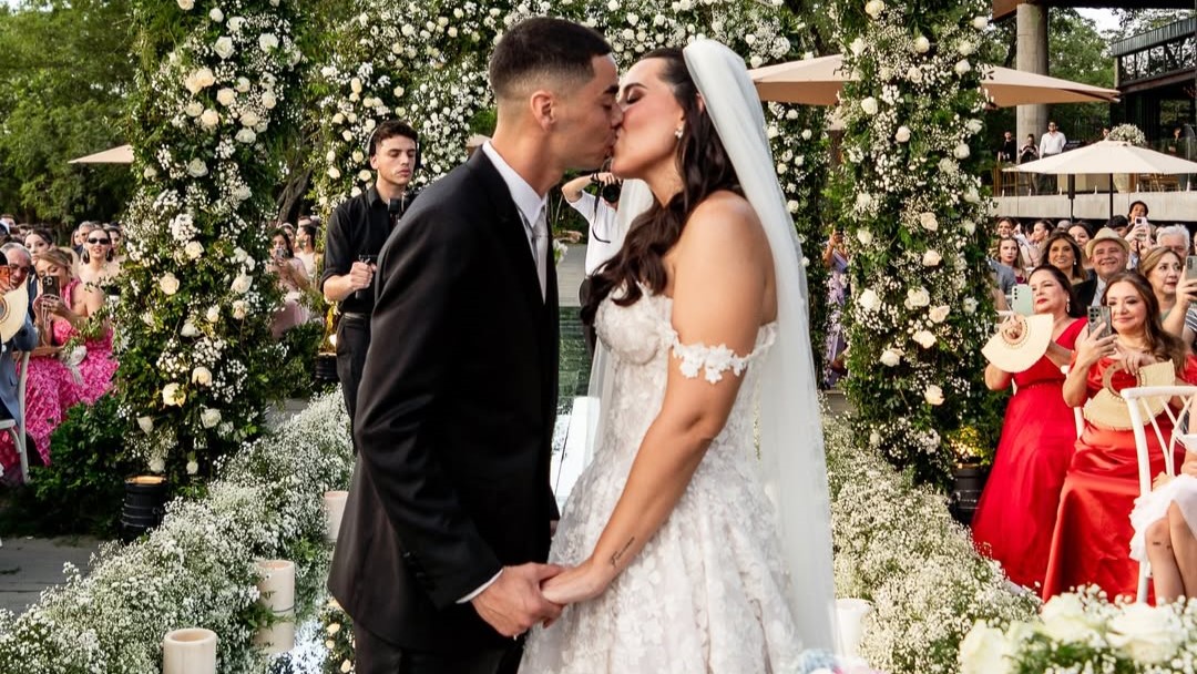 “Prometo amarte incluso cuando estás de malhumor o cuando estés con el celular y no me hagas caso”, le dijo Miguel Almirón a su esposa, lo que generó risas entre los presentes a la gran boda que se hizo el sábado en San Bernardino.